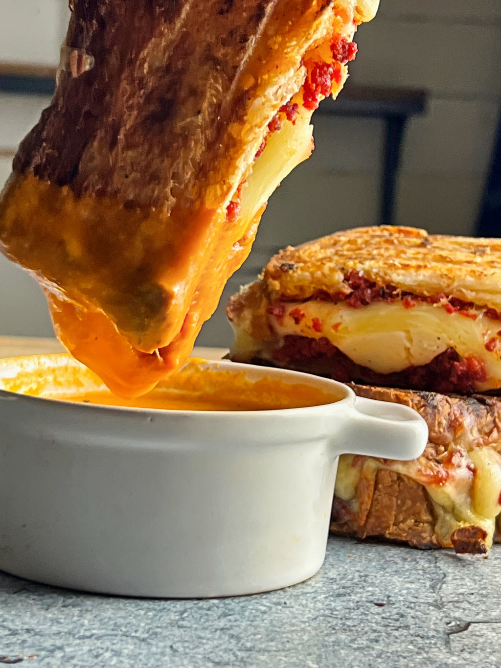 Coloque una sartén de hierro grande en la parrilla con la tapa cerrada durante aproximadamente 10 minutos o hasta que esté caliente. Una vez que la sartén esté caliente, agregue el aceite y espere unos 15 segundos. Luego agregue la cebolla y el chorizo. Cocine el chorizo hasta que esté ligeramente dorado. Retira la mezcla de chorizo de la sartén de hierro y reserva. Retire la sartén de hierro de la parrilla y cierre la tapa de la parrilla. A continuación monta el queso a la plancha. Use dos rebanadas de pan. Agregue 2 cucharadas de mezcla de chorizo a una rebanada de pan. Distribuir uniformemente. Luego coloque 4 rebanadas de queso mozzarella y 1/4 de taza de queso oaxaca sobre la mezcla. Termina colocando otras 2 cucharadas de chorizo encima del queso y coloca la segunda rebanada de pan encima. Haga esto para las rebanadas de pan restantes.