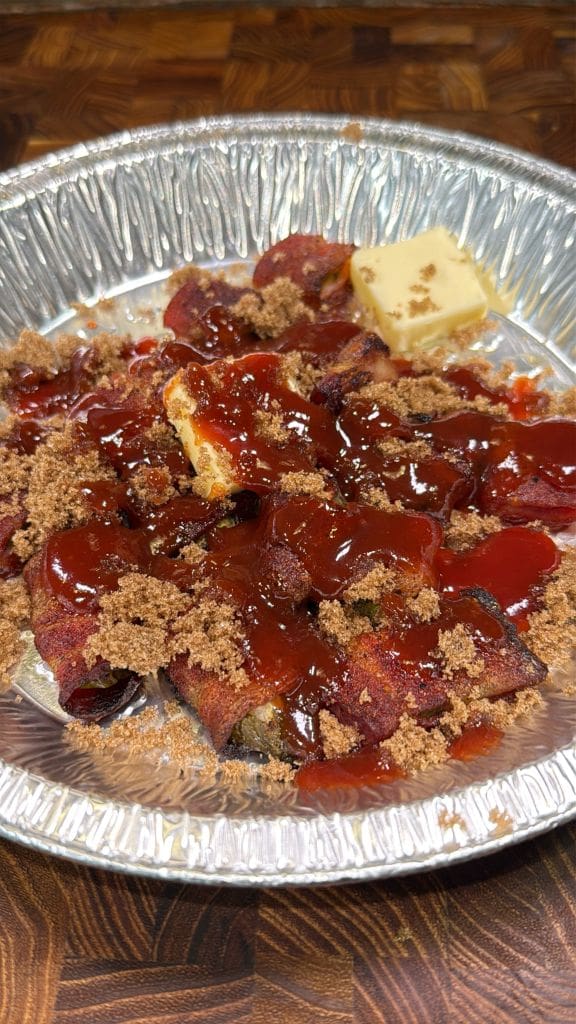 Place bacon wrapped pickles into aluminum pan with butter, brown sugar, and BBQ sauce and cover tightly with aluminum foil.