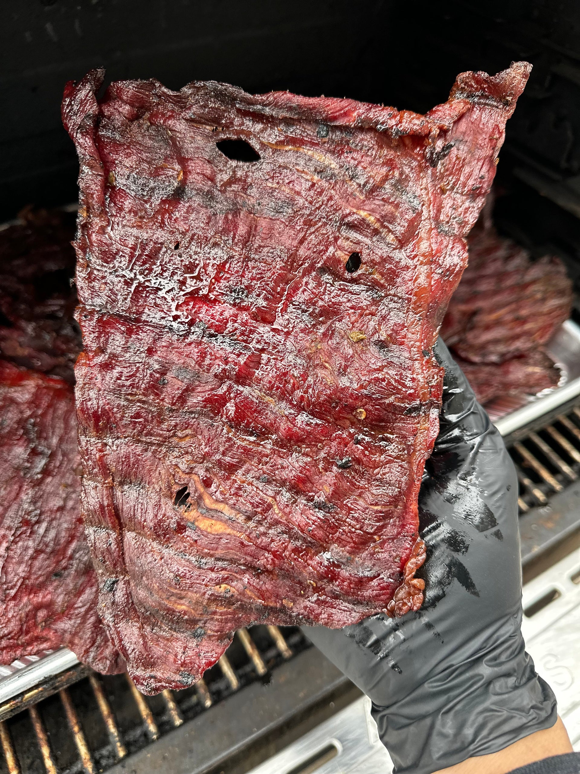 Once it’s on the Masterbuilt XT, the key is patience. Low, steady heat and clean smoke from lump charcoal and apple wood slowly dry the meat without cooking it, creating that perfect jerky texture. A final dusting of adobo ties everything together with a punch of flavor that keeps you coming back for more.