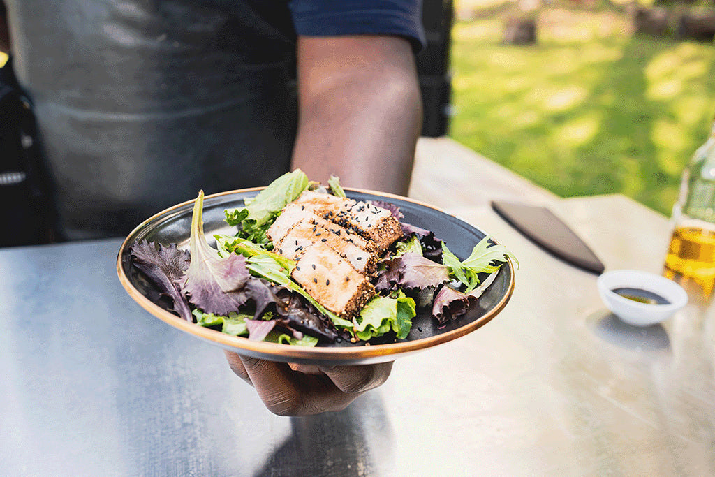 Instead of a traditional tuna salad with mayo, Rasheed serves this dish over fresh power greens, drizzles it with extra virgin olive oil, and finishes with a sprinkle of black sesame seeds. The smoky, seared tuna pairs perfectly with the crisp greens, creating a dish that is light, satisfying, and packed with flavor—a perfect meal for any time of year.