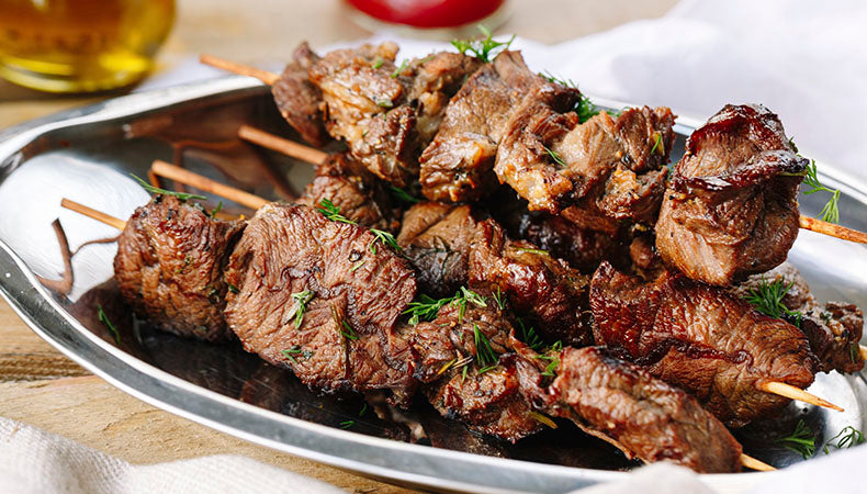 Drain meat, reserving marinade. On 8 long metal skewers, alternately thread the meat and onion wedges, leaving thread the meat and onion wedges, leaving about ¼ inch space between pieces.