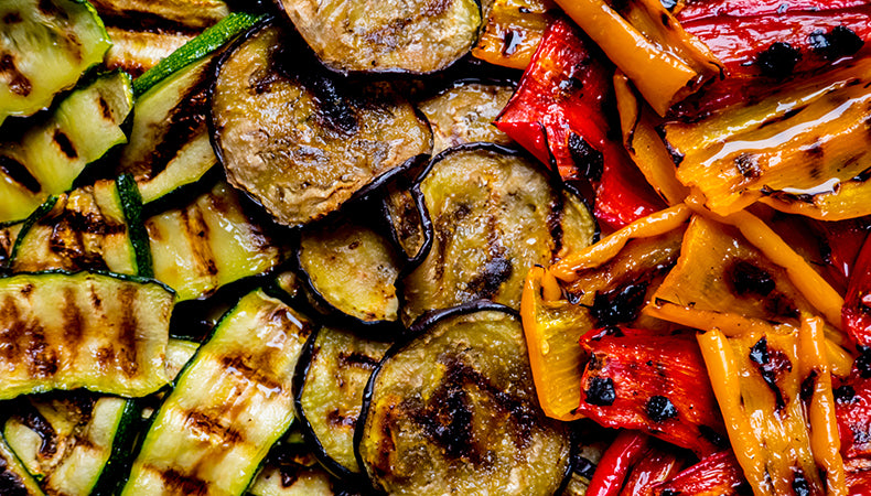 Drizzle olive oil and balsamic vinegar over vegetables and toss vegetables again. Make sure all veggies are covered with oil, vinegar, and spices.