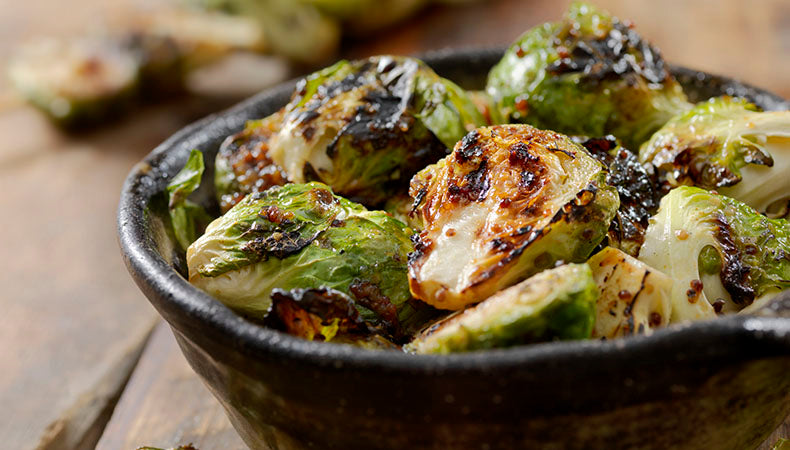 Heat a cast iron skillet in the smoker until very hot. While the pan is heating, slice the brussel sprouts in half.