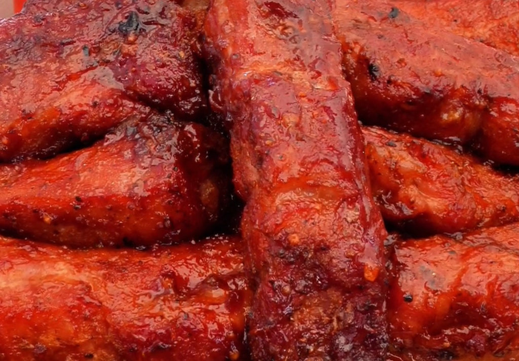 After braising, place the ribs back onto the grill, and brush on a Sweet and Zesty Sauce. Let it tack on to get nice and thick and delicious crust.