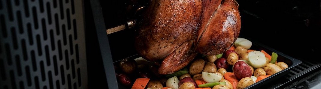 A turkey roasts on a spit over a tray of vegetables in a Gravity Series grill