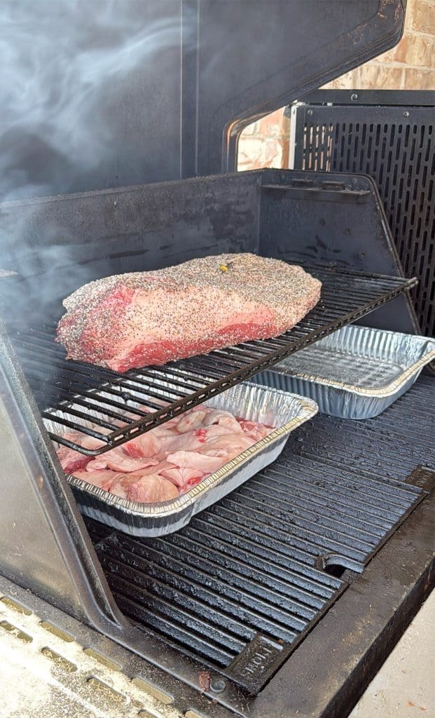 Place on smoker fat side up, with a water pan underneath. Close lid and allow to smoke at 200F for about 2 hours. At that time the rub should be dry, give it a spray with water or beef broth, and increase temperature to 250F.