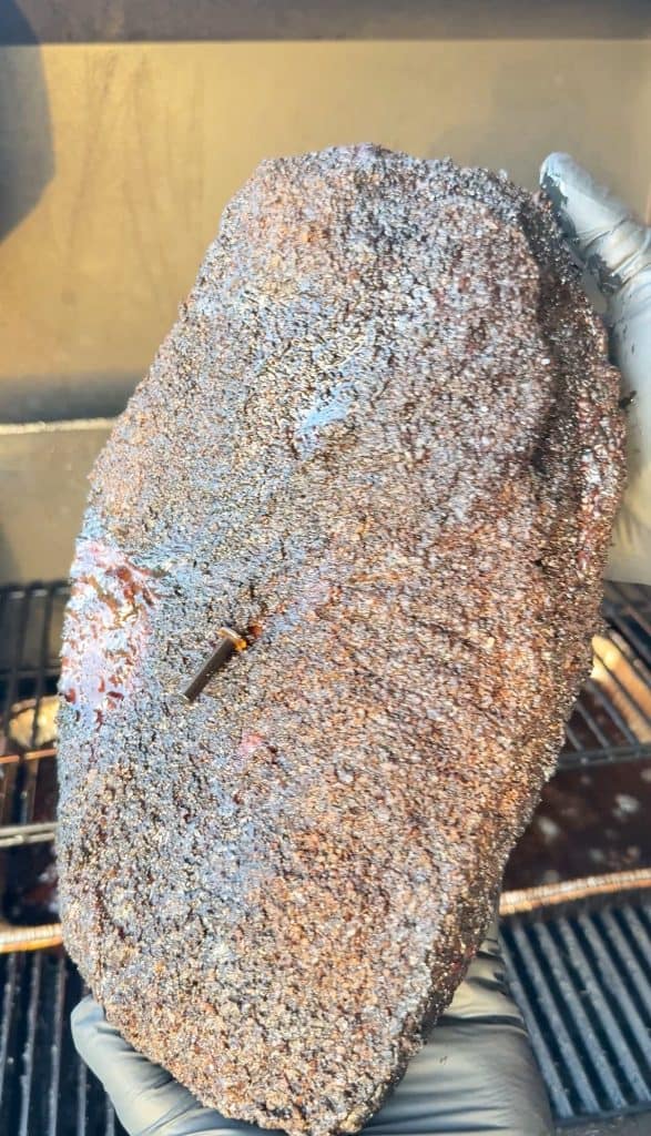 When the entire brisket feels like sticking your probe into warm butter, it's done. Remove it and tightly wrap in aluminum foil with beef tallow if desired, for 2 hours. This does 2 things. 1.) it allows the cooking to stop so that it doesn't carryover to over cook. 2.) it's going to allow the internal juices to move back to the center of the meat to stay moist.