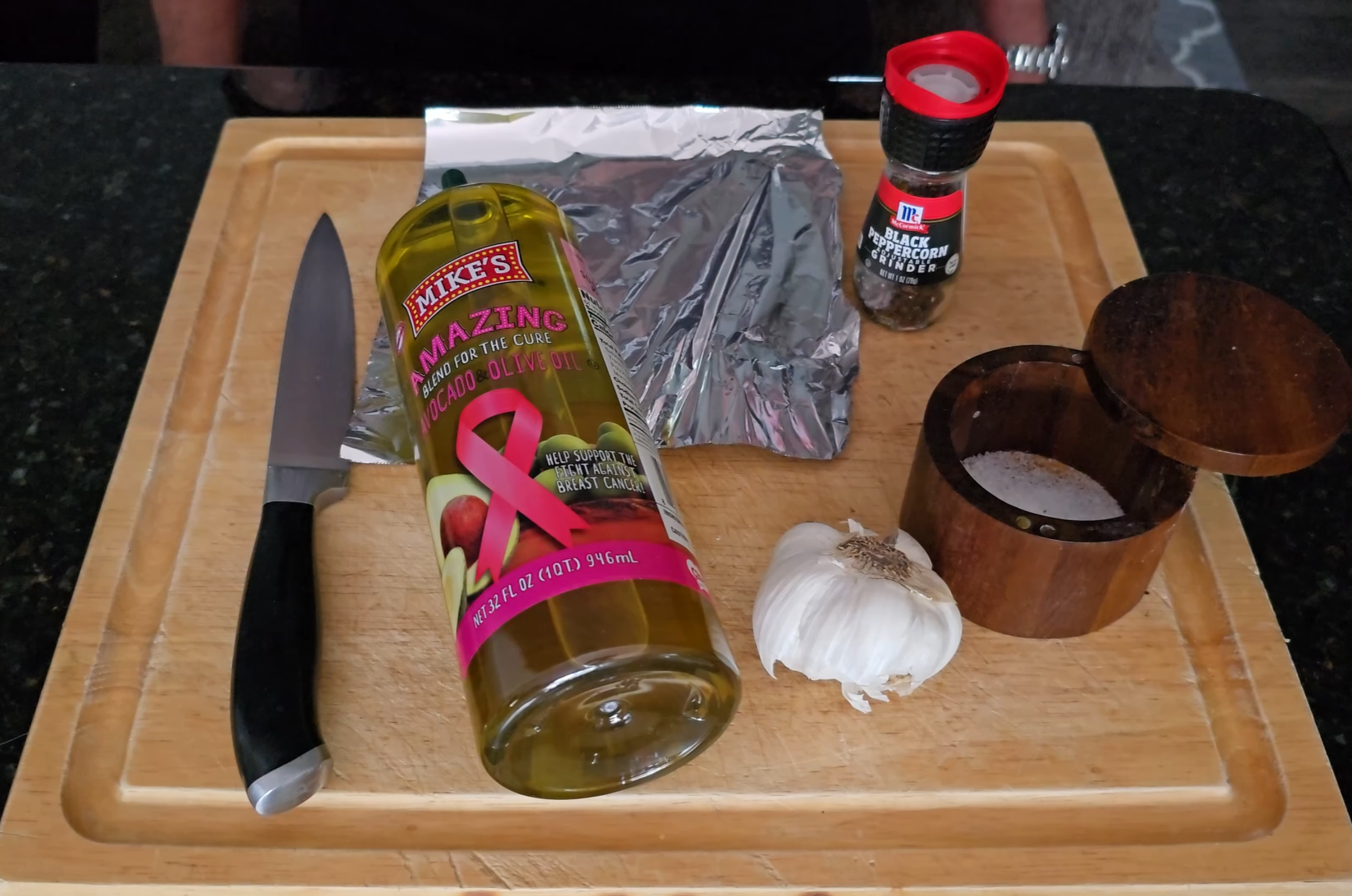 Fire up your Masterbuilt Gravity Series and set the temperature to 350°F. Take a full garlic bulb and slice about ⅛ inch off the top to expose the cloves. Drizzle the bulb with olive oil and season lightly with salt and black pepper. Place the garlic on the grill and cook for about 40 minutes, until the cloves are soft, golden, and caramelized. Remove from the grill and allow it to cool slightly.
