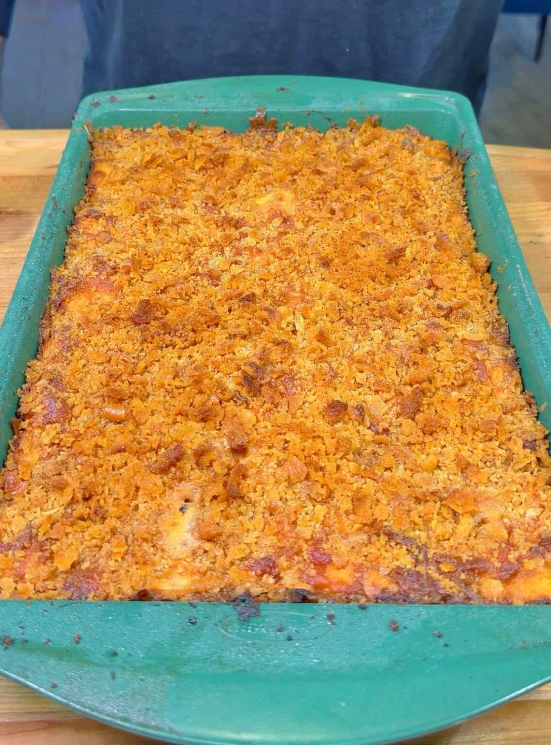 Evenly sprinkle the pre-toasted Ritz and cheddar topping over the mac and cheese. Bake uncovered for 25–30 minutes until bubbly and the crust is deep golden.